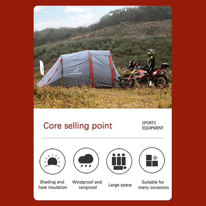 ·This camping tent with spacious design stores a full-sized motorcycle with room for 2-3 people to sleep comfortably;Includes a separate, secure enclosure attached to the inner tent for storing your bike and gear.